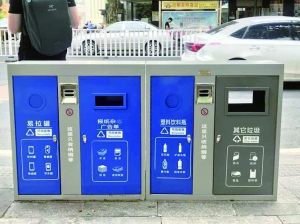 5 月 17 日,在中山東路全民健身中心門口的公交站臺,一組分類垃圾桶亮相。和以往可回收物和其它垃圾的兩分類桶不同,這個垃圾桶分得格外細致,光可回收物就分成了三類,為藍色箱體,分別設置易拉罐投放口、報紙雜志廣告單投放口、塑料飲料瓶投放口。為了防止市民搞不清楚,易拉罐投放口下還貼上了了啤酒罐、可樂罐等標識;報紙雜志廣告單投放口下貼了書本、雜志、報紙、廢舊紙張等標識。塑料飲料瓶投放口下貼上了可樂瓶、果汁瓶、純凈水瓶等標識。此外,還有專門的煙蒂投放處。