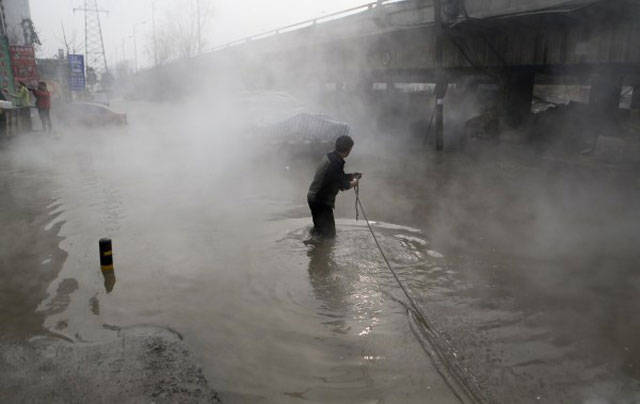 ? ? 路面積水淹沒了貨車輪胎,導致車輛熄火。2015年12月24日,灃東新城對快速干道西段的400多家違建予以拆除,這幾天正在清理垃圾。不料誤將建筑垃圾填入了污井,導致了水漫街頭。