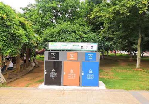 三分類非機械式垃圾設備是封閉式的,箱體設置了醒目的三種顏色,分別用于回收干垃圾、濕垃圾和可回收垃圾。相比于普通垃圾桶容量更大,走進也不會聞到異味,上方還設置了宣傳欄,幫助大家了解垃圾分類。