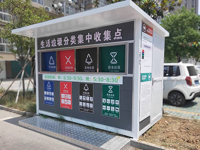 目前,戶外生活垃圾分類集中收集房是城市生活垃圾處置的主流趨勢,也是現代城市文明進步的標志之一,有利于提升垃圾清運效率,便于再生資源的回收利用,減少環境污染,緩解環衛工人常規保潔的壓力。垃圾分類亭,分為地基基礎設施、公益宣傳欄、立柱、頂棚等,亭內設置可回收、有害垃圾、廚房垃圾和其他垃圾等垃圾桶,垃圾桶及宣傳欄配有垃圾分類的宣傳標語,廣大群眾可以根據垃圾桶的提示標語,將廢棄的生活垃圾投放到對應的垃圾桶中。