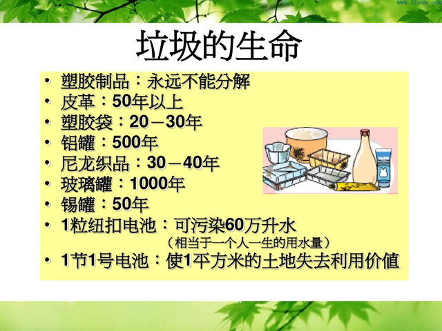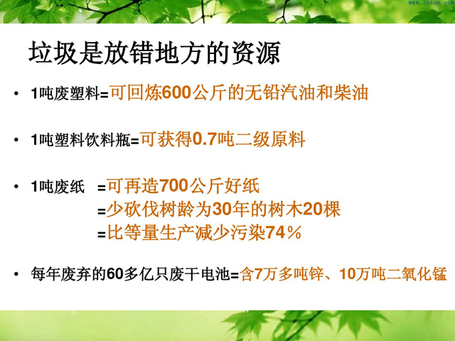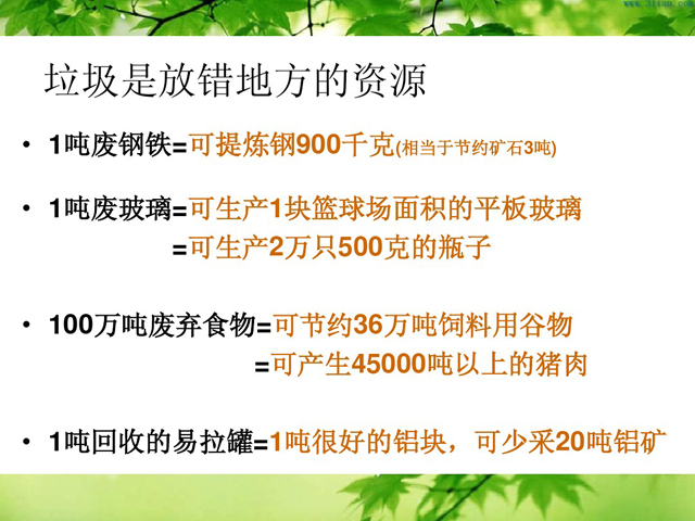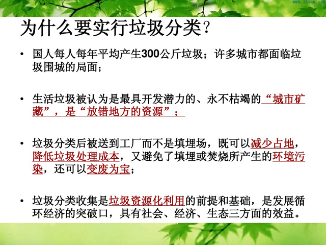國(guó)人每人每年平均產(chǎn)生垃圾300公斤,許多城市都面臨垃圾圍城的局面;生活垃圾被認(rèn)為是最具開(kāi)發(fā)潛力的、永不枯竭的城市礦藏,是放錯(cuò)地方的資源;垃圾分類后被送到工廠而不是填埋場(chǎng),既可以減少耕地,降低垃圾處理成本,又避免了填埋或焚燒所產(chǎn)生的環(huán)境污染,還可以變廢為寶;垃圾分類收集是垃圾資源化利用的前提和基礎(chǔ),是發(fā)展循環(huán)經(jīng)濟(jì)的突破口,具有社會(huì)、經(jīng)濟(jì)、生態(tài)三方面的效益。