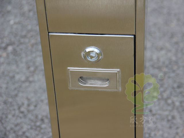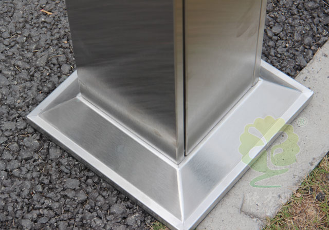 C280方形不銹鋼滅煙柱規格250*250*1080mm,呈長條方型,側面有三角鑰匙,可以打開側門,方便清理位于內套管的煙蒂煙灰,底座分兩種,一種是室內采用的,在底部裝有防滑墊,一種是戶外采用的,底部使用膨脹螺絲固定。