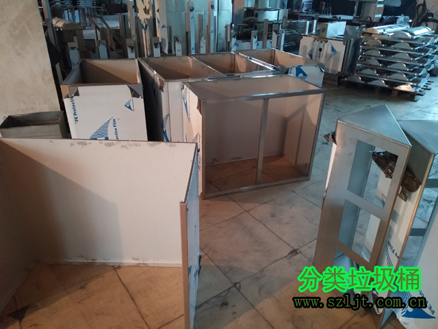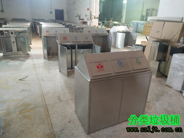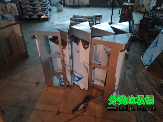 小區物業不銹鋼三分類垃圾桶生產組裝圖片: