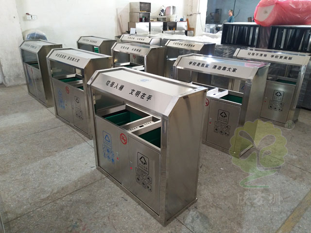 這款垃圾桶采用內外桶雙層模式,內桶使用玻璃鋼內桶,優點是質量輕,堅固耐用,防水防秀,相對于鐵皮內桶來說,使用時間更長,性價比更高。外殼使用優質304不銹鋼作為原材料,擁有良好的防腐防銹功能,使用先進的激光切割機、折彎機經過一系列專業精準的切割、折彎、組裝、焊接、打磨、絲印步驟處理而成。