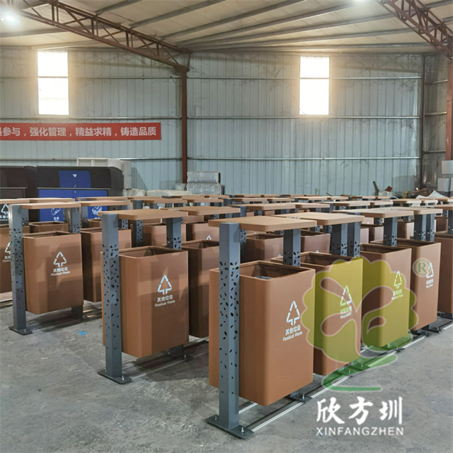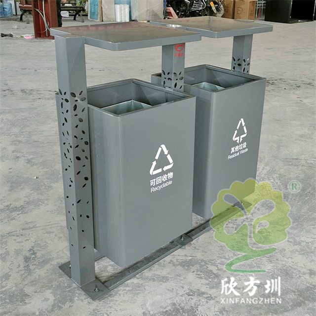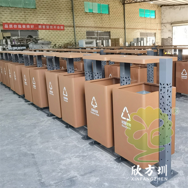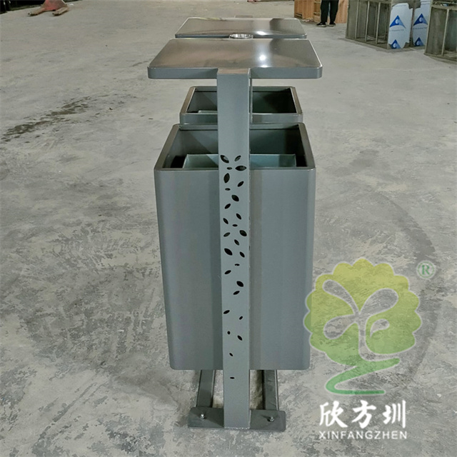 廣東惠州景區(qū)鏤空立柱不銹鋼分類垃圾桶整體1.0mm厚噴塑外筒,方形任意組合式多分類設(shè)計,可以選擇用不銹鋼板制作桶身,桶身表面噴涂噴塑了米白色,背后可使用三角鑰匙開始開門取出內(nèi)筒,內(nèi)筒鍍鋅板0.4mm厚,正面絲印了最新國標(biāo)分類標(biāo)識,有現(xiàn)成的網(wǎng)版可以免費絲印分類標(biāo)識。