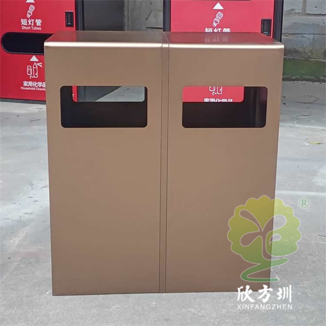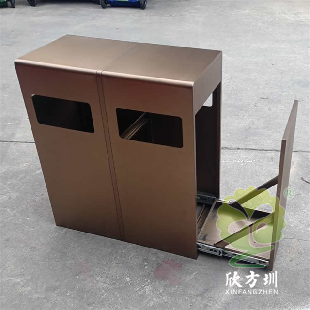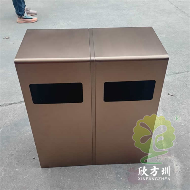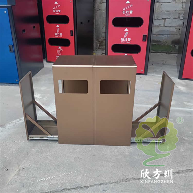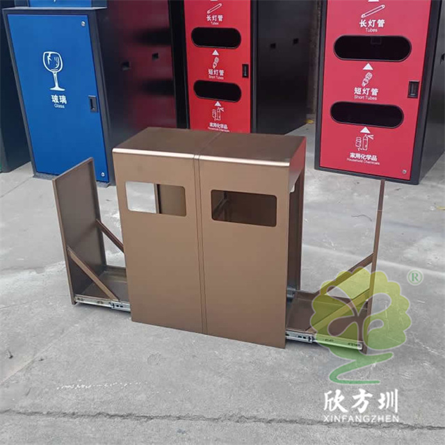 抽拉式滑軌電鍍防指紋不銹鋼分類垃圾桶采用了304不銹鋼1.5mm厚的板制作而成,側(cè)面兩連體分類抽拉式滑軌設(shè)計(jì),果皮箱金屬表面電鍍香檳金和做防指紋處理工藝,正反面可以油墨絲網(wǎng)印刷國標(biāo)分類標(biāo)識和企業(yè)logo,可以定制本色或者噴塑桶身。