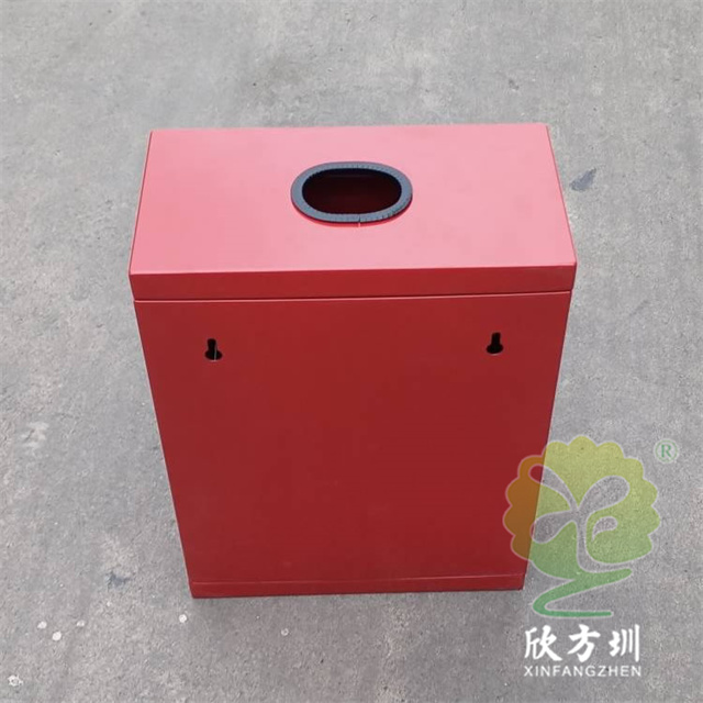 掛壁式噴粉烤漆方形不銹鋼有害垃圾箱采用0.8mm厚201不銹鋼板制造,也可以采用鍍鋅鐵板制作,方形掛壁式橢圓形直投口設計,金屬表面噴粉烤漆紅色上色,正面采用三角鑰匙可以取出內置的鍍鋅板內筒,投口帶膠墊防止投放時刮傷手掌。