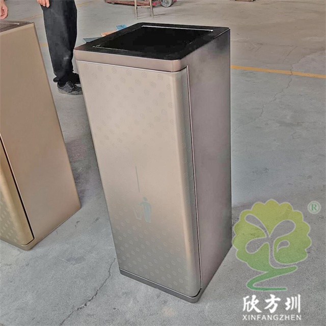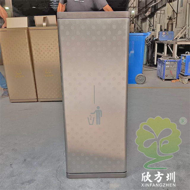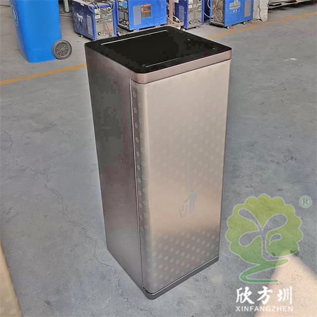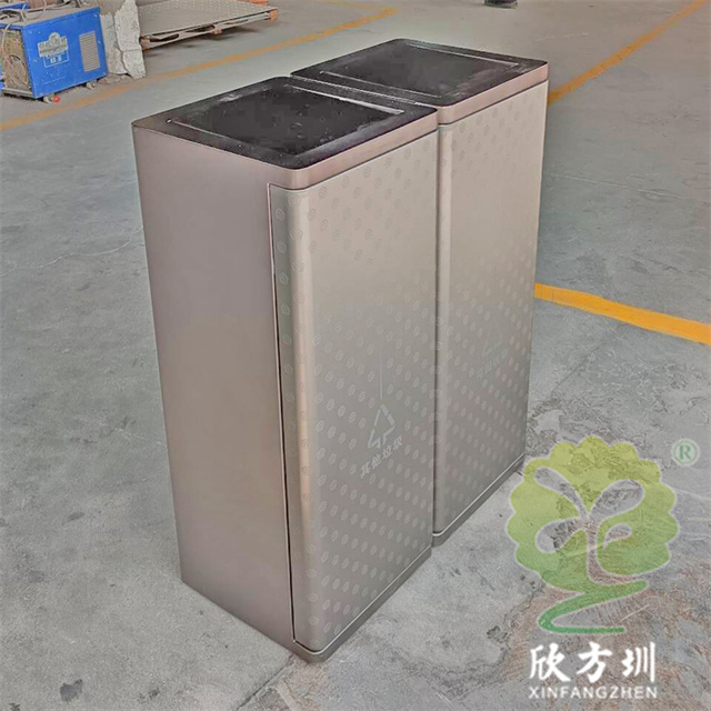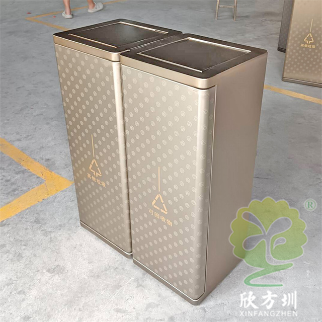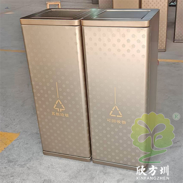 室內(nèi)電鍍腐刻不銹鋼分類垃圾桶單筒可以采用201/304不銹鋼板制造,兩個(gè)款式一款是單筒一款是兩分類方形帶搖擺蓋設(shè)計(jì),雙筒用8*8mm方通相連,門板腐刻印花工藝,不銹鋼金屬表面做了電鍍黑鈦和香檳金工藝,正面抽拉式導(dǎo)軌抽可以取出內(nèi)膽,門板中心位置絲網(wǎng)印刷最新中英文國標(biāo)分類標(biāo)識或人頭標(biāo)。
