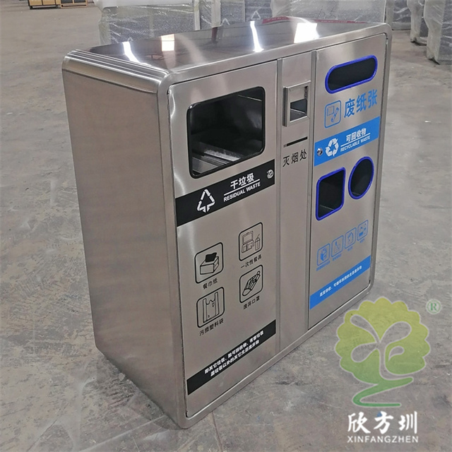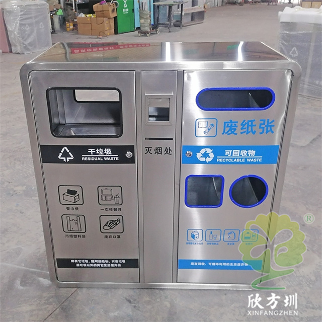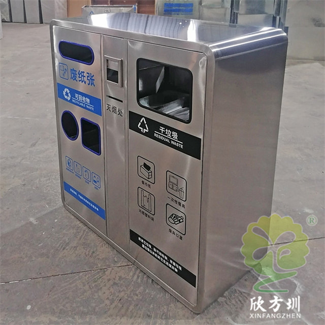 戶外大容量城市街道不銹鋼分類垃圾桶可以采用201/304不銹鋼板制造,表面烤漆噴塑了就可以做鍍鋅板材質的,雙面可回收物多個投口設計,有長方形廢報紙、方形投口、圓形塑料瓶投口,方形干垃圾投口,投口膠條封邊防止割手,中間位置帶滅煙盒,投口顏色可以定制。