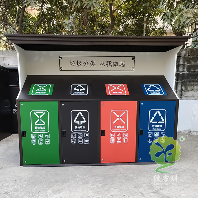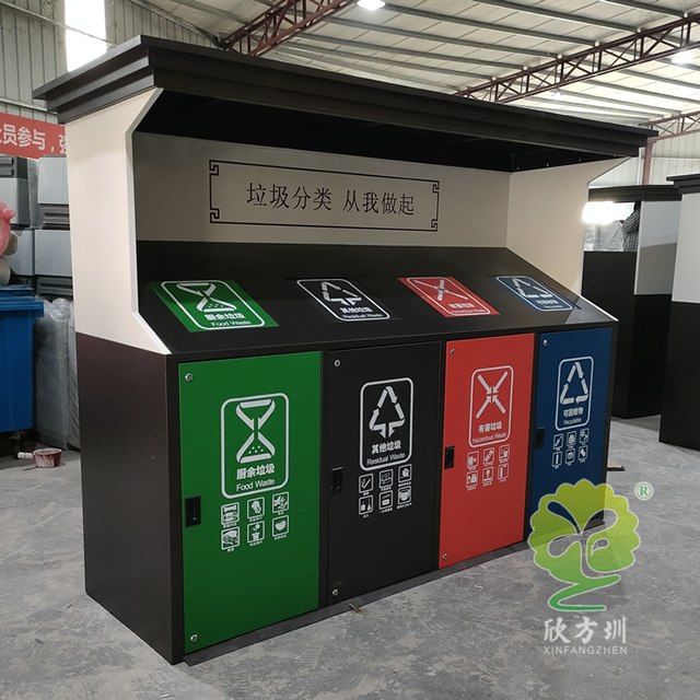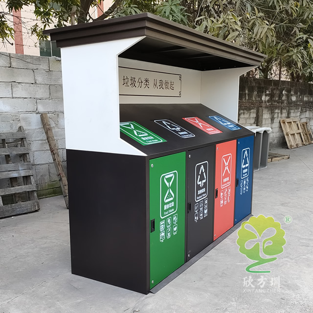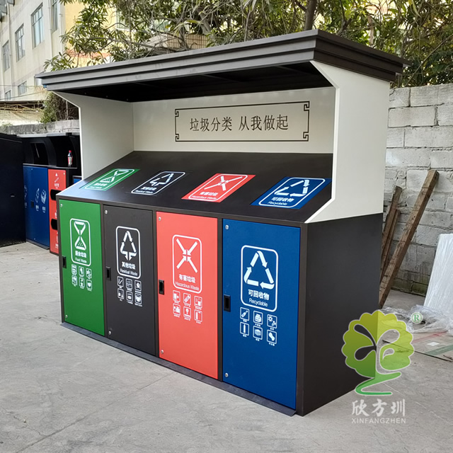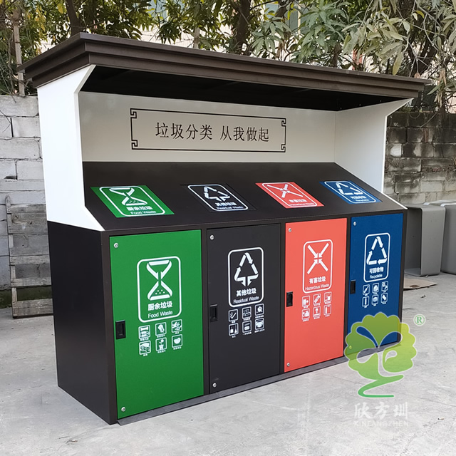 城市道路小區鍍鋅板四分類垃圾亭采用了鍍鋅板制作而成,四分類屋形設計,桶身采用了噴塑黑白配色,桶蓋和門板四色噴塑分別廚余垃圾綠色噴塑、其他垃圾黑色噴塑、有害垃圾紅色噴塑、可回收物藍色噴塑,桶蓋和門板油墨絲網印刷了最新的國標分類標識,正面亭子中心印刷了垃圾分類從我做起。