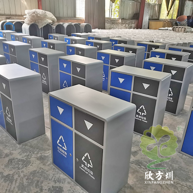 戶外搖蓋學校鋼板分類垃圾桶是采用優質的冷軋鋼板制作而成,有條件的客戶可以挑選201/304不銹鋼板做,方形搖晃蓋兩分類連體規劃,表面框架噴塑了米白色,可回收物門板和投口蓋子噴塑藍色,其他垃圾門板和搖晃蓋子噴塑了灰色,表面絲印最新國標分類標識,標識下方絲印了英文的翻譯,蓋子下方絲印三角形往下推的箭頭,欣方圳垃圾桶廠家支持定制,有需要可以聯絡咱們客服人員。