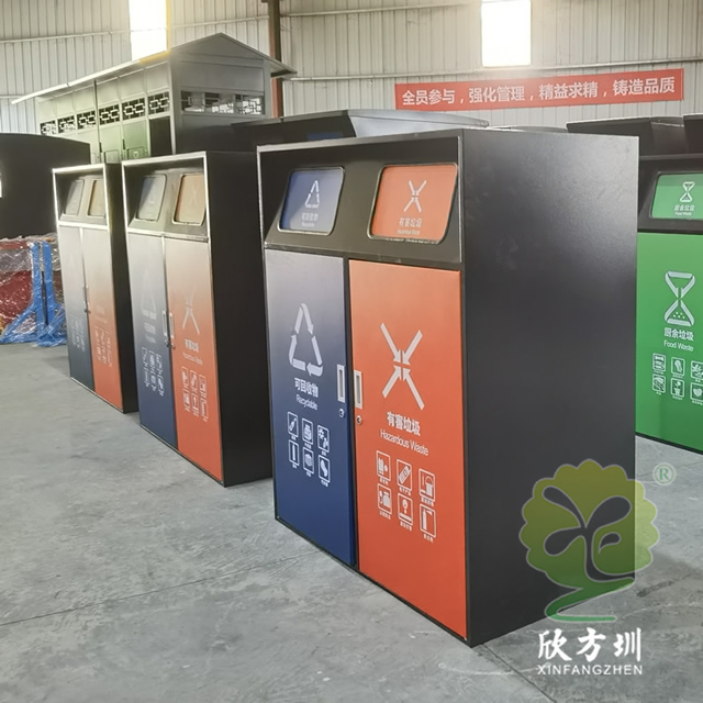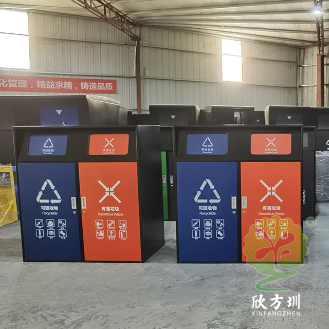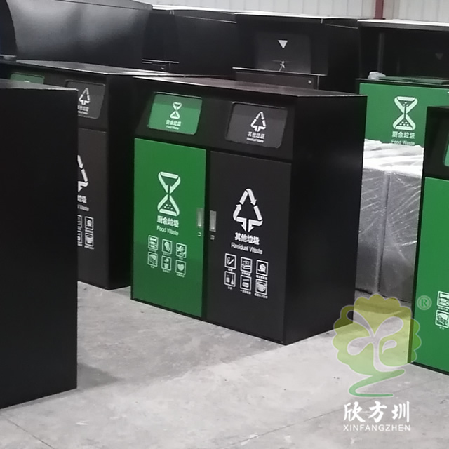 戶外組合帶蓋鍍鋅板分類垃圾桶外桶采用了鍍鋅板制作而成,兩連體組合分類方形搖擺蓋設(shè)計(jì),外桶表面黑色噴涂噴塑,這款垃圾桶用戶是兩套組合成了四分類,門板和蓋子噴塑了不相同的顏色,廚余垃圾噴塑了綠色,其他垃圾噴塑了黑色,可回收物噴塑了藍(lán)色,有害垃圾噴塑了紅色,門板上絲印了最新國(guó)標(biāo)分類標(biāo)識(shí),可以使用三角鑰匙開(kāi)門取出內(nèi)筒。